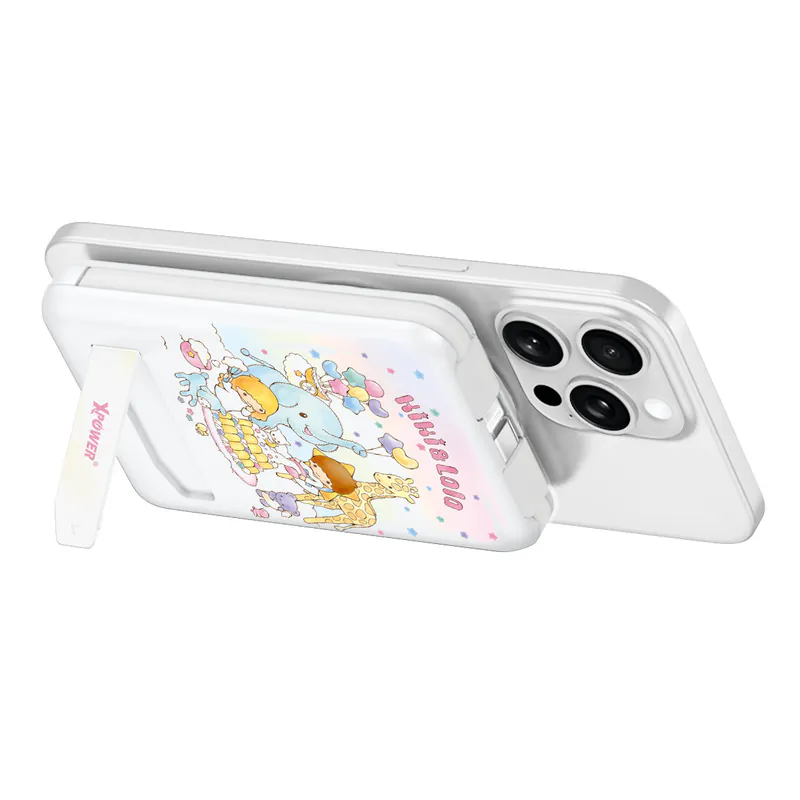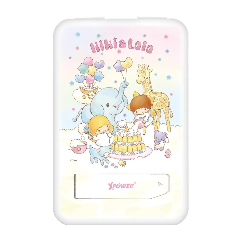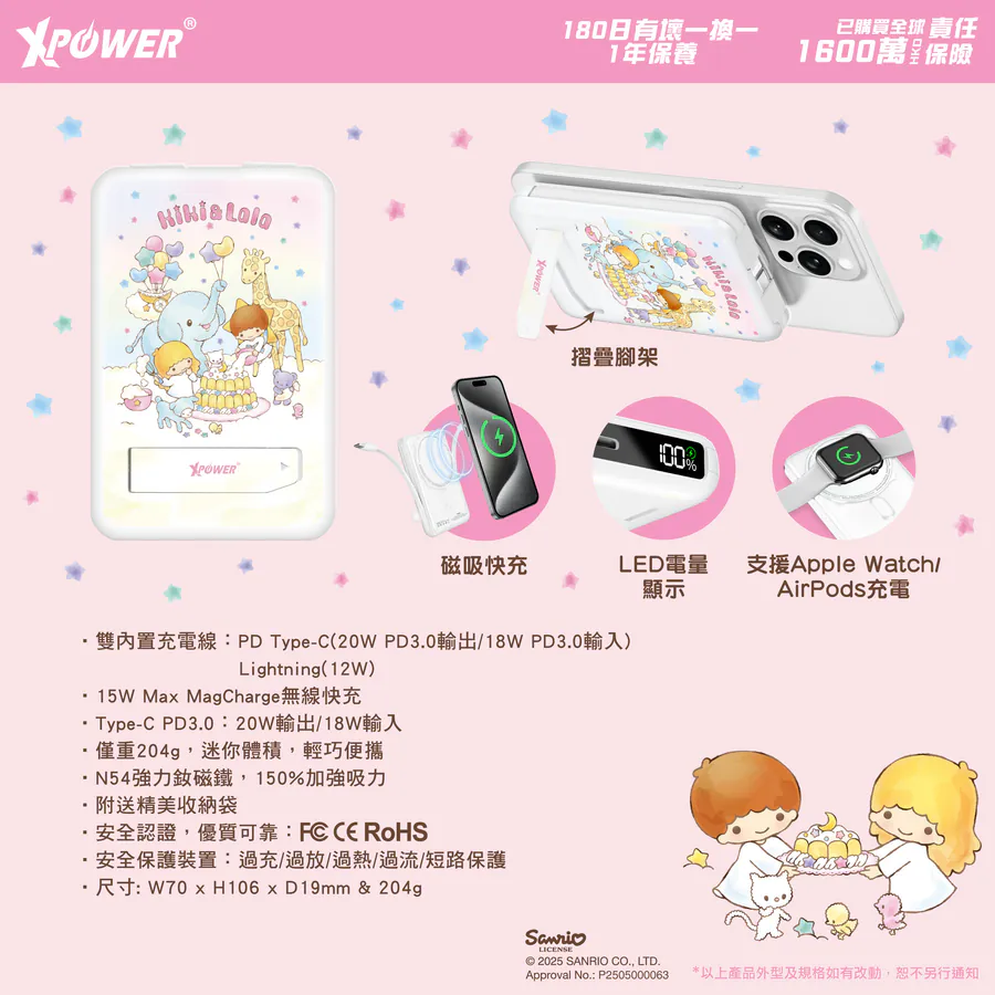 (1C1L版)XPower x Sanrio Little Twin Stars Kiki & Lala 週年系列M10C+ 6合1 10000mAh多功能迷你20W PD3.0+ 磁吸無線快充移動電源 •雙內置充電線: PD Type-C(20W PD3.0輸出/18W PD3.0輸入)Lightning(12W) •MagCharge無線快充(15W Max): 支援iPhone, AirPods, Apple Watch •Type-C PD3.0: 20W輸出/18W輸入 •僅重204g,迷你體積,輕巧便攜 •N54強力釹磁鐵,150%加強吸力 •摺疊腳架,方便觀賞影片 •LED電量顯示 •附送精美收納袋 •安全認證,優質可靠: CE, FCC, RoHS •安全保護裝置: 過充/過放/過熱/過流/短路保護 •尺寸: W70 x H106 x D19mm & 204g