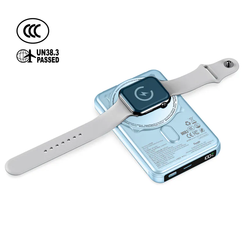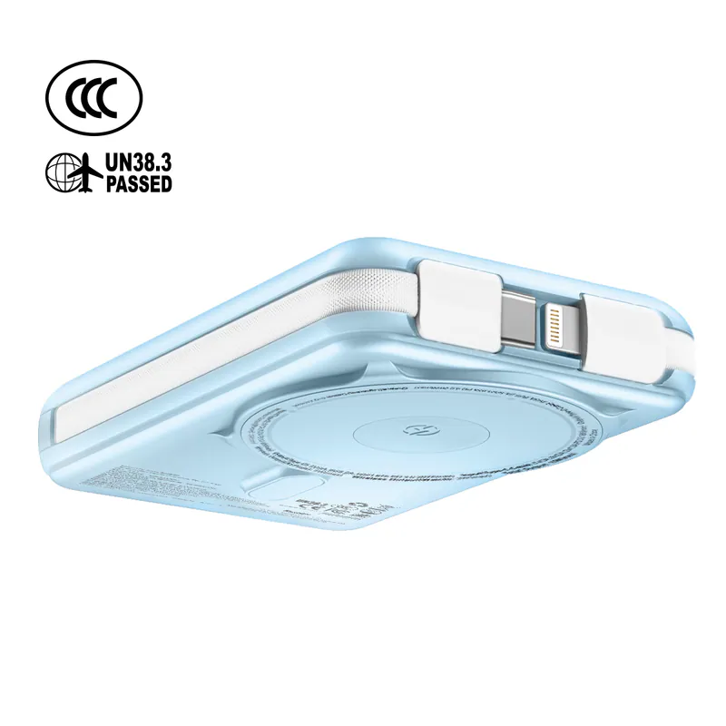 •雙內置充電線:PD Type-C(20W PD3.0輸出/18W PD3.0輸入)+Lightning(12W) •MagCharge無線快充(15W Max):支援iPhone, AirPods, Apple Watch •Type-C PD3.0:20W輸出/18W輸入 •僅重204g,迷你體積,輕巧便攜 •N54強力釹磁鐵,150%加強吸力 •摺疊腳架,方便觀賞影片 •LED電量顯示 •附送精美收納袋 •安全認證,優質可靠:CE/FCC/ROHS •安全保護裝置:過充/過放/過熱/過流/短路保護 •尺寸: W70 x H106 x D19mm & 204g