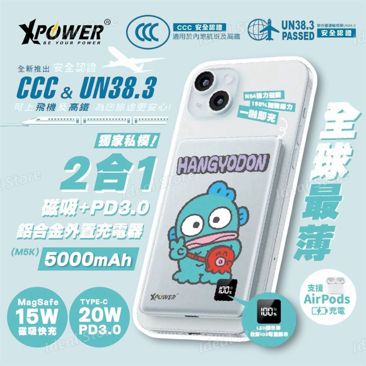 (3C認證版) XPOWER x Sanrio HANGYODON M5K 3合1磁吸+PD3.0 5000mAh鋁合金移動電源|3C認證|水怪|兼容 MagSafe|磁吸充電|尿袋|行動電源|充電寶|無線充電器
