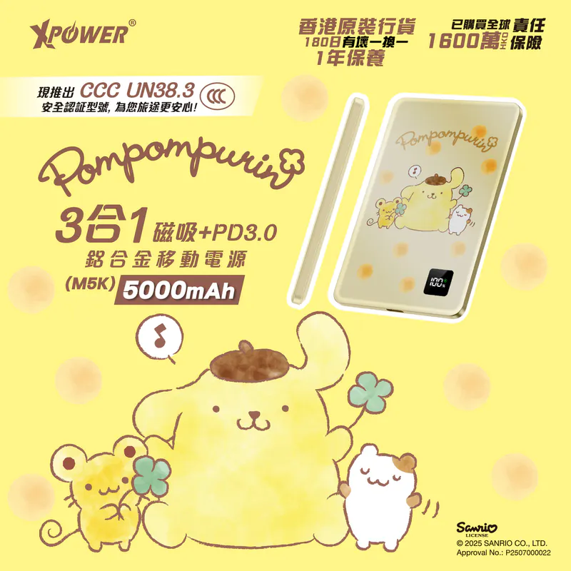 (3C認證版)XPower x Sanrio Pompompurin 3合1磁吸+PD3.0 5000mAh鋁合金移動電源 (M5K)
