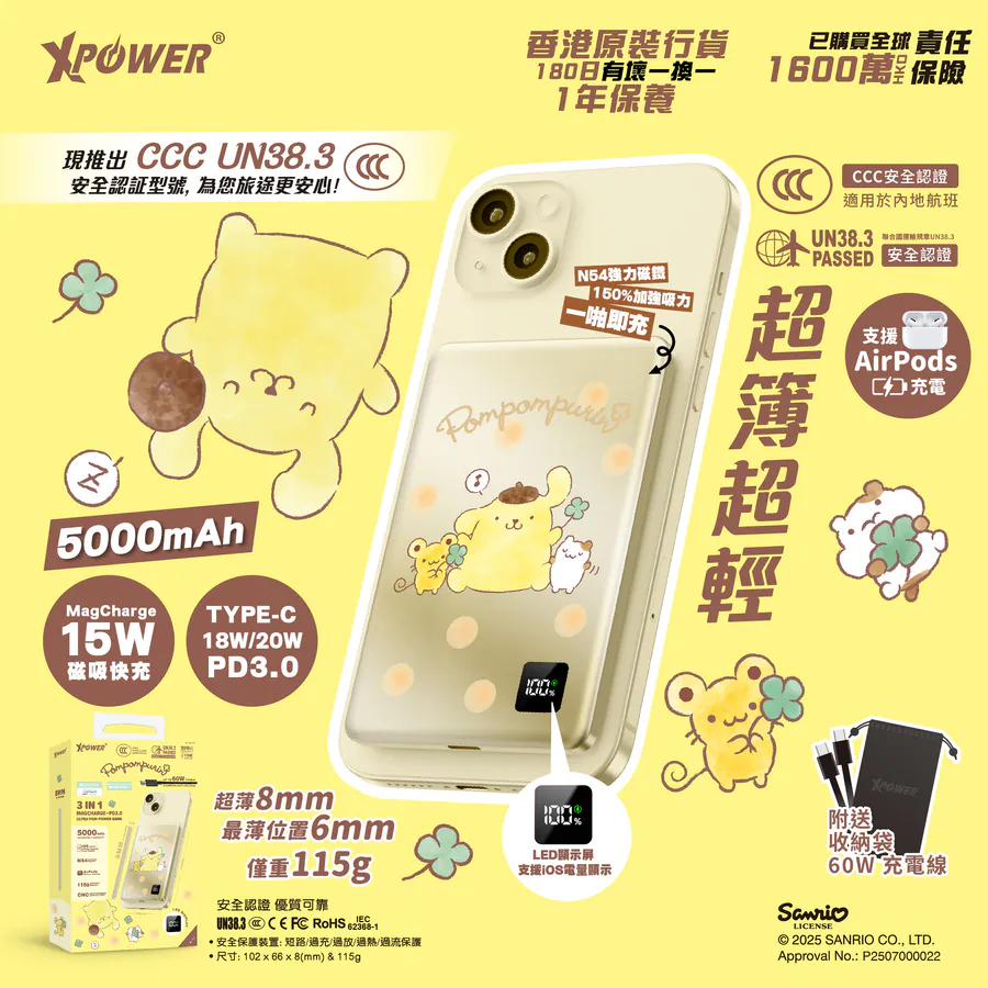 (3C認證版)XPower x Sanrio Pompompurin 3合1磁吸+PD3.0 5000mAh鋁合金移動電源 (M5K) •2輸出: 磁吸無線充(最大15W) / Type-C(20W PD 3.0) •可快充iPhone15/16, Plus, Pro及Pro Max等,支援iOS電量顯示 •Type-C 18W/20W PD 3.0輸入及輸出 •支援AirPods無線充電 •不虛標真5000mAh石墨烯負極100%純鈷電池,加強散熱效能 •僅重115g及超薄8mm,迷你體積,輕巧便攜 •102mm完美Fit位,不凸出、不擋鏡頭 •N54強力釹磁鐵,150%加強吸力 •超方便一啪即充 •CNC切割圓角鋁合金機身 •LED電量顯示 •附送60W鋁合金Type-C線 •安全認證:UN38.3 CCC CE,FCC,ROHS,IEC62368-1 •安全保護裝置: 短路/過充/過放/過熱/過流保護 •尺寸: 102 x 66 x 8(mm) & 115g