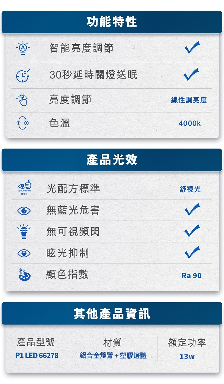 [飛利浦直送 原裝行貨2年保養]  Philips 飛利浦 66278 P1 LED 護眼檯燈 (三段調光 / 蜂巢光學透鏡 / 4000K 自然光) Philips 66278 P1 Eye-Comfort LED Desk Lamp (3-Level Dimming / Honeycomb Lens / 4000K Natural Light)
