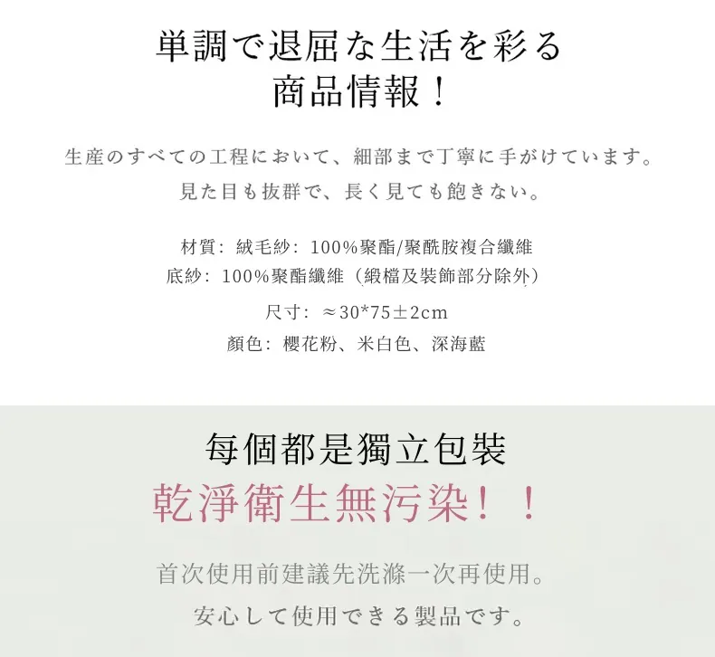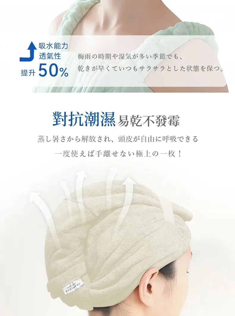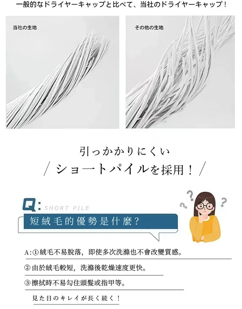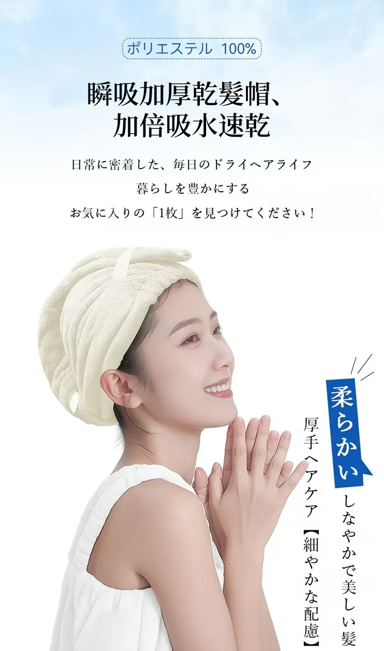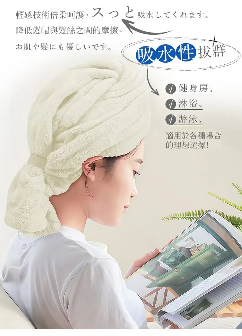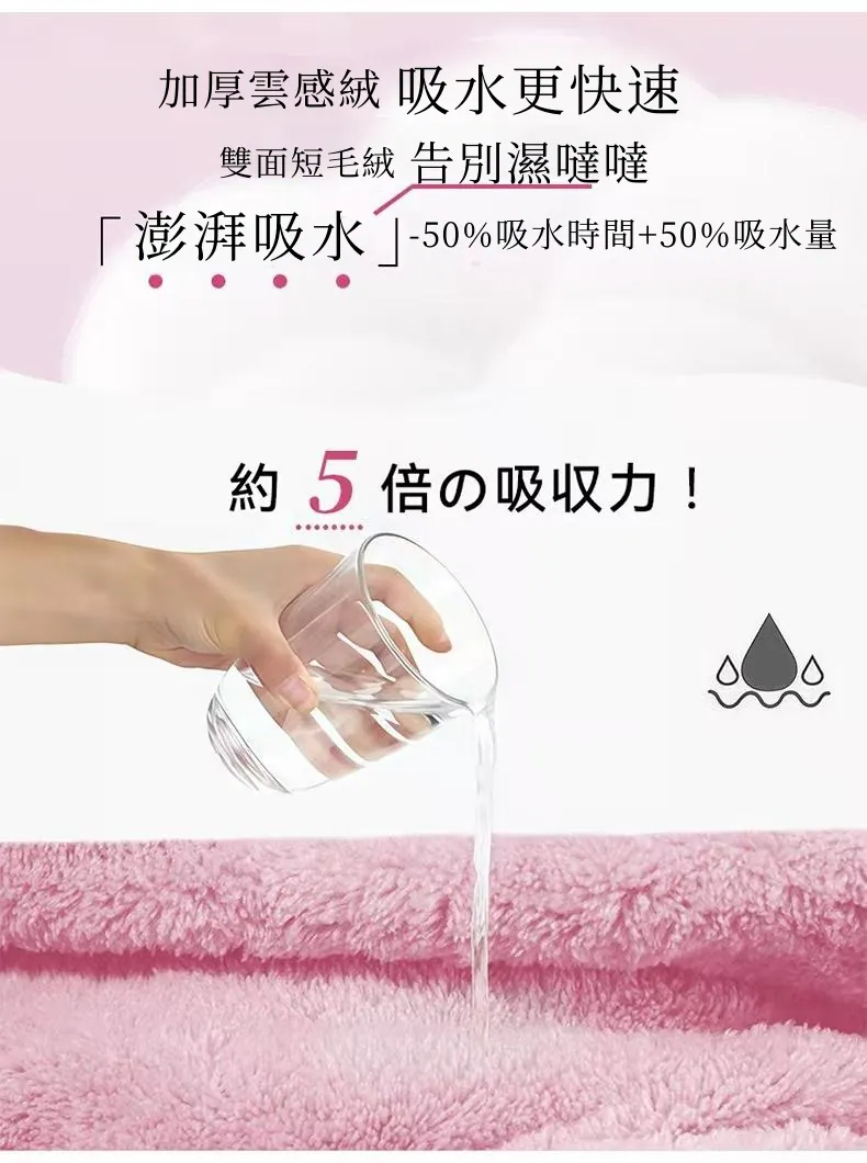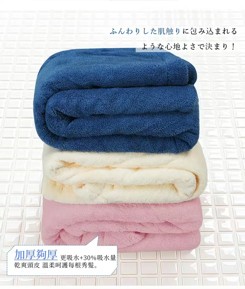 日本 速乾亁髮帽 瞬吸加厚亁髮帽。 吸水性良好,比一般亁髮帽吸水量更大,所以能達到速乾的效果。 加厚雲感雙面短毛絨,觸感更舒服的同時,吸水也更快速。 超大容量,髮量再多也能包裹住。 健身房、淋浴間、游泳後,亁髮的最佳選擇。 3種顏色可選:米白色、深藍色、粉紅色