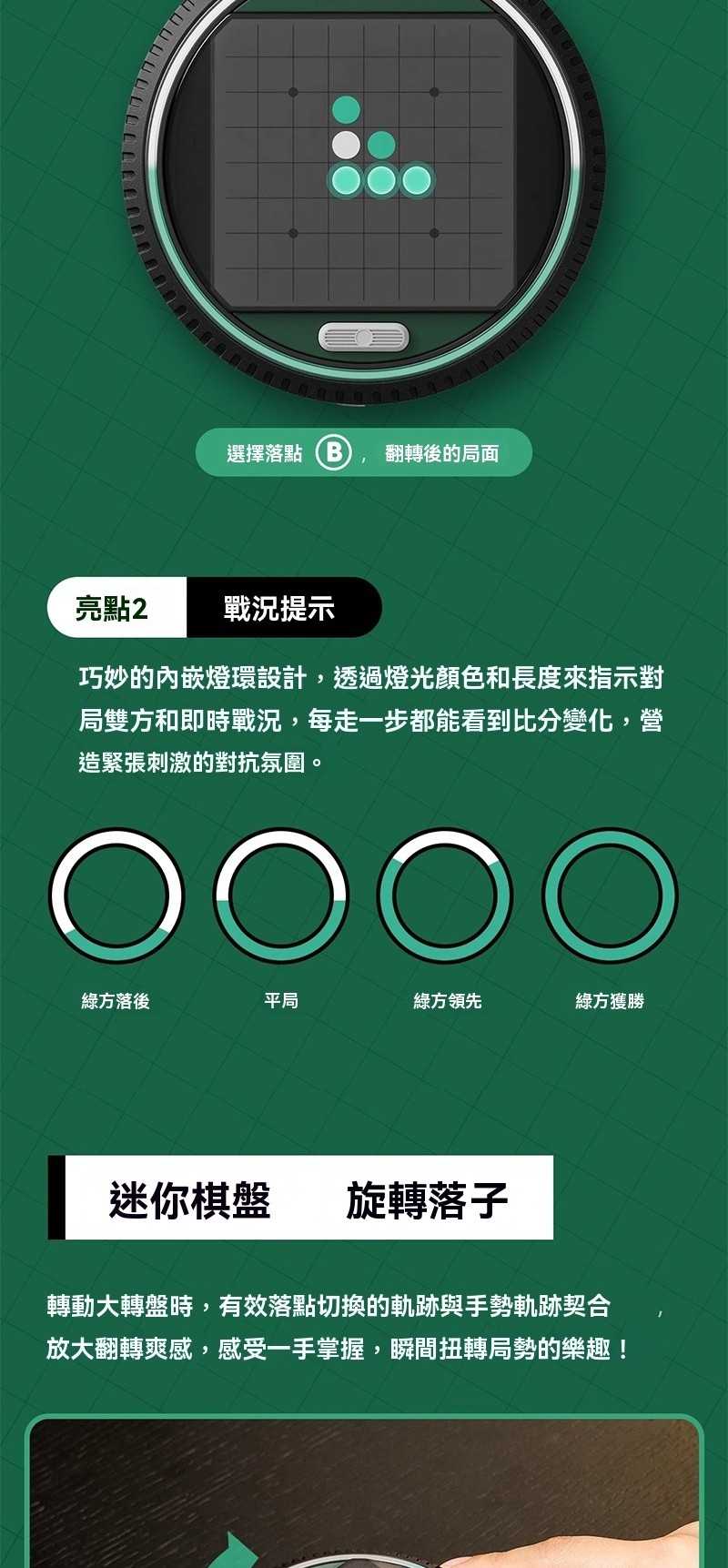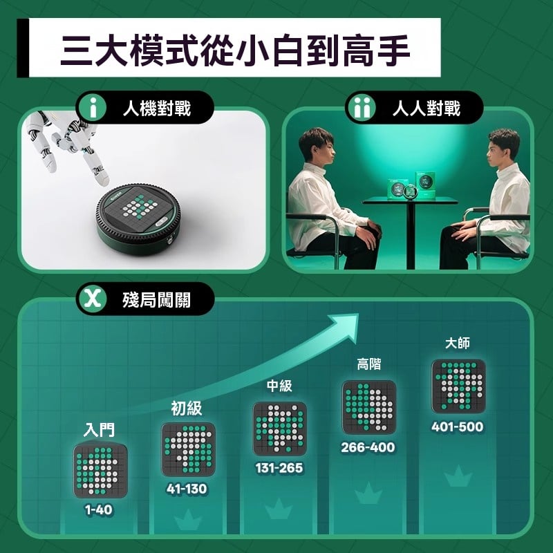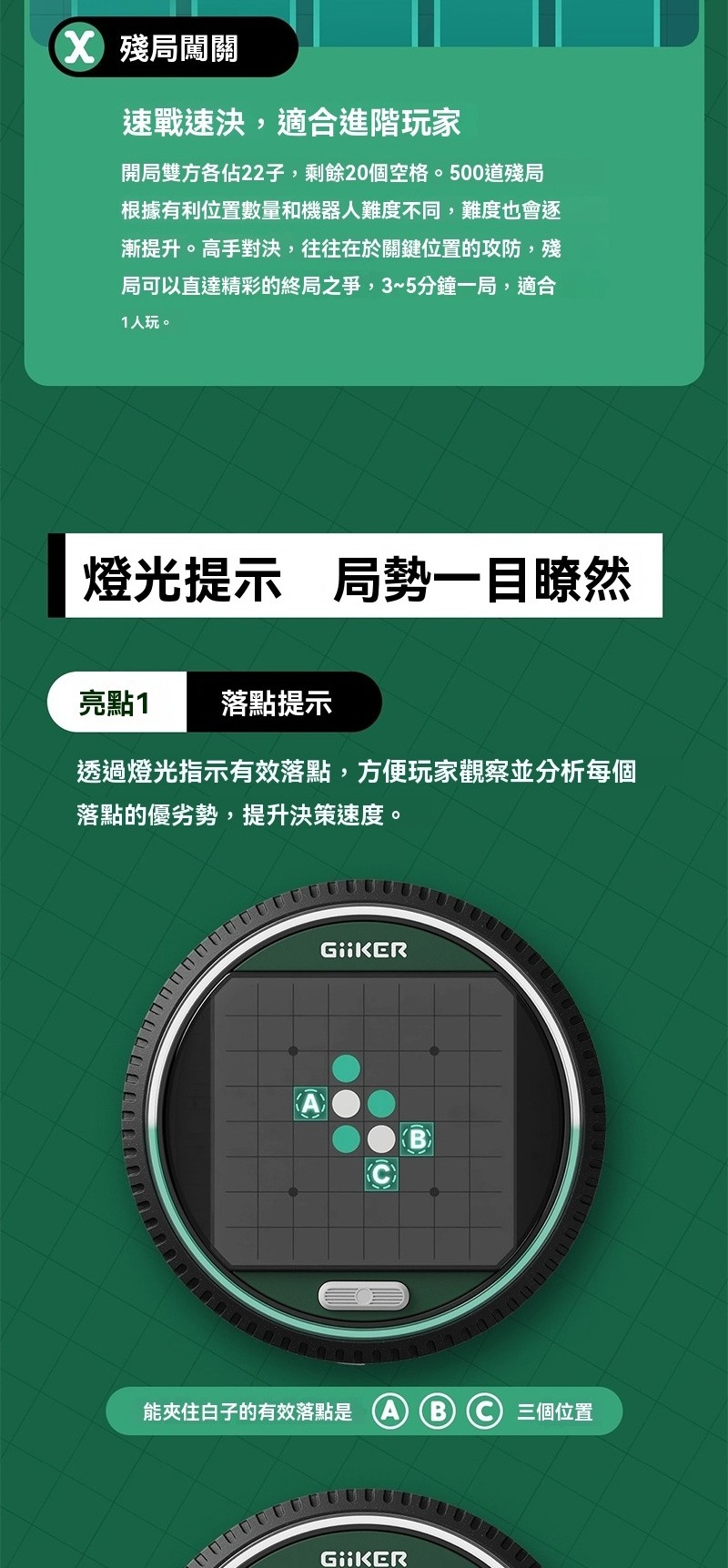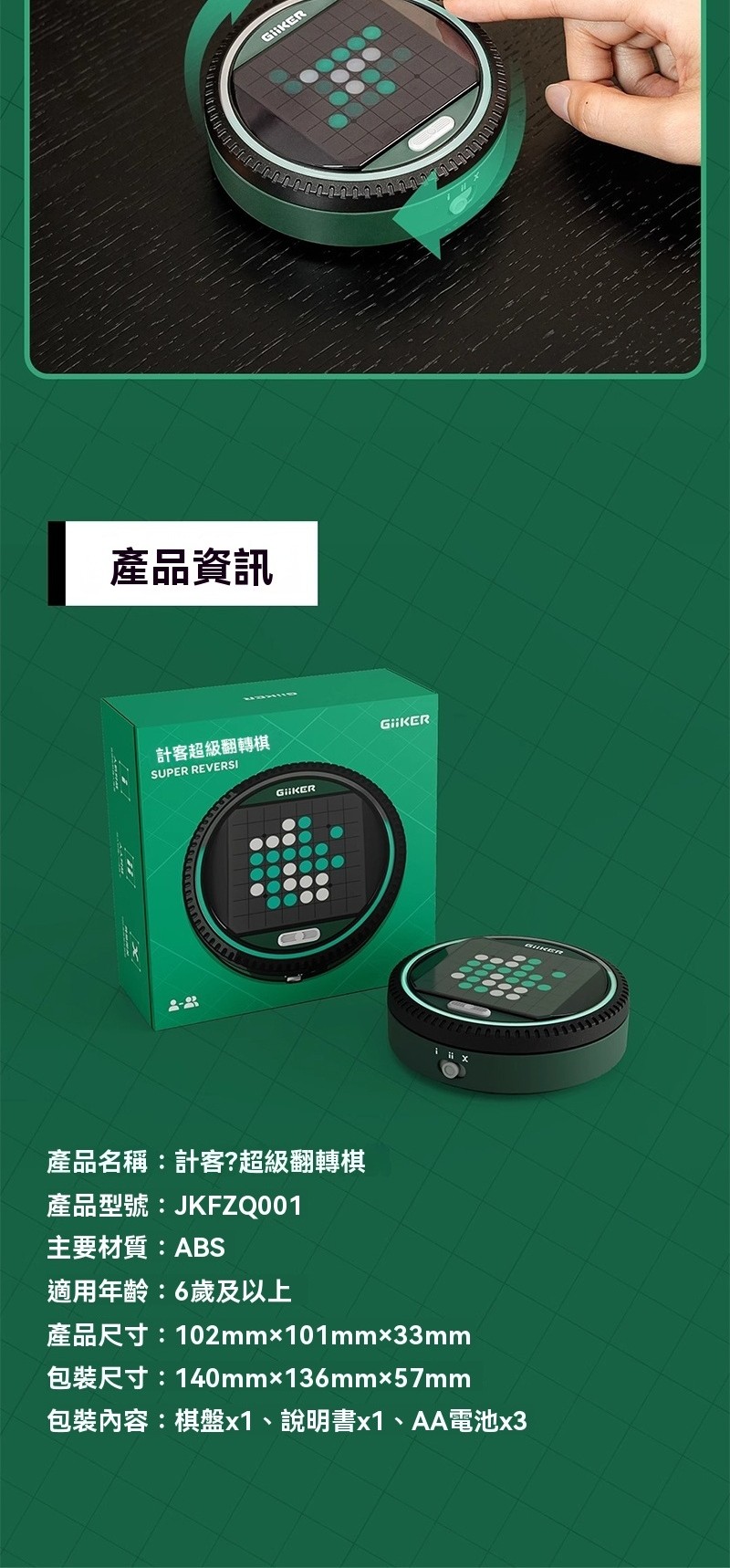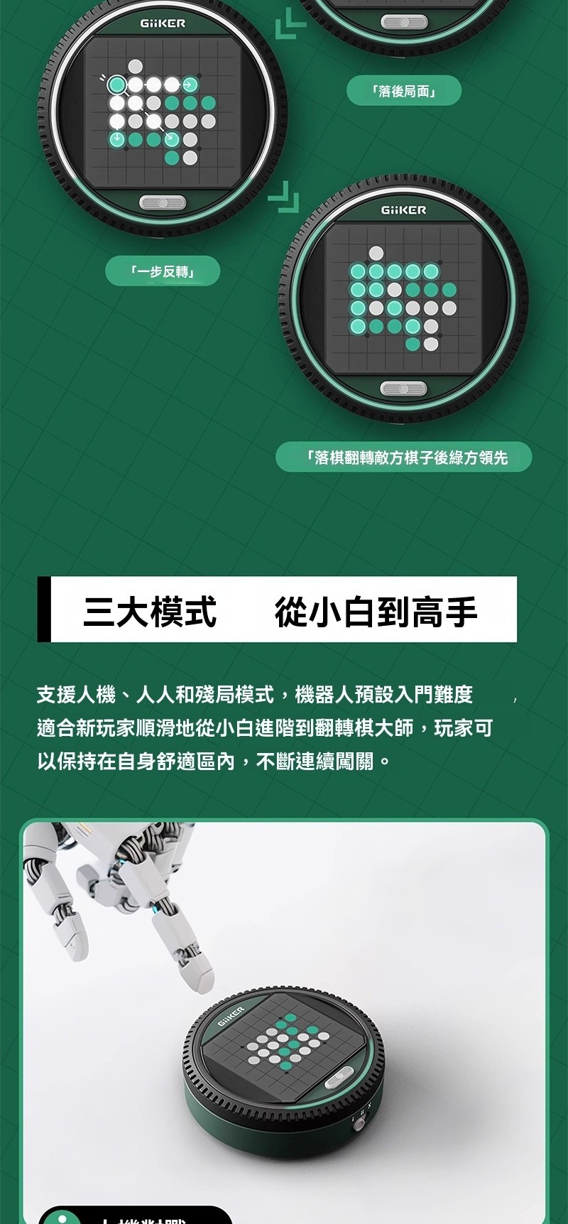計客超級翻轉棋是一款專爲3-12歲兒童設計的AI智能黑白棋桌遊,採用磁吸式棋子+可摺疊智能底座+嵌入式AI芯片架構,支持藍牙連接手機App,實現人機對戰、雙人對戰、闖關訓練三大模式。整機尺寸約40×40×6cm,重量僅1.8kg,輕騎可攜式,收納方便。