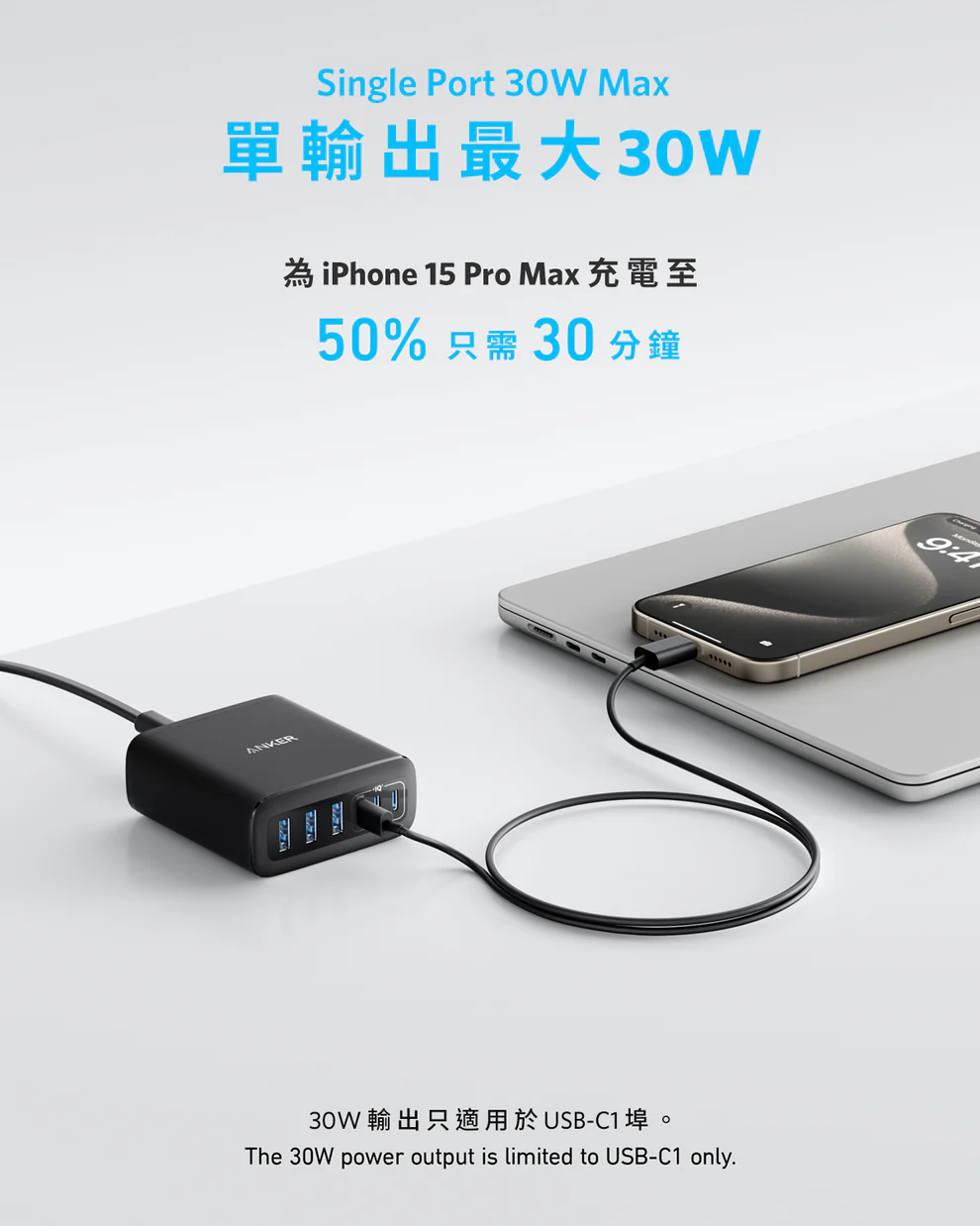 USB-C1 可提供最大 30W PD 輸出,為 MacBook Air 充電至 50% 只需約 1 小時 40 分鐘,或為你的 iPhone 15 Pro Max 由 0% 快充至 50% 只需 30 分鐘。