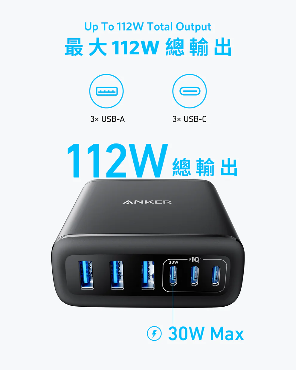 配備3個USB-C及3個USB-A,提供合計112W輸出,給你充足的電力為不同裝置充電。