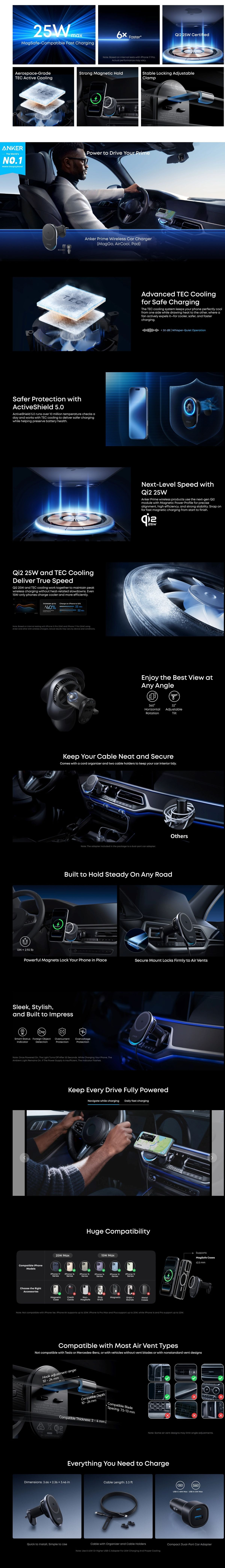Anker - Anker Prime Wireless Car Charger (MagGo, AirCool, Pad) QI2 25W 磁吸充電車用支架,Qi2 25W認證及兼容Magsafe的最大25W快充;航天級TEC冷卻模組,支援更安全、高效的25W快充