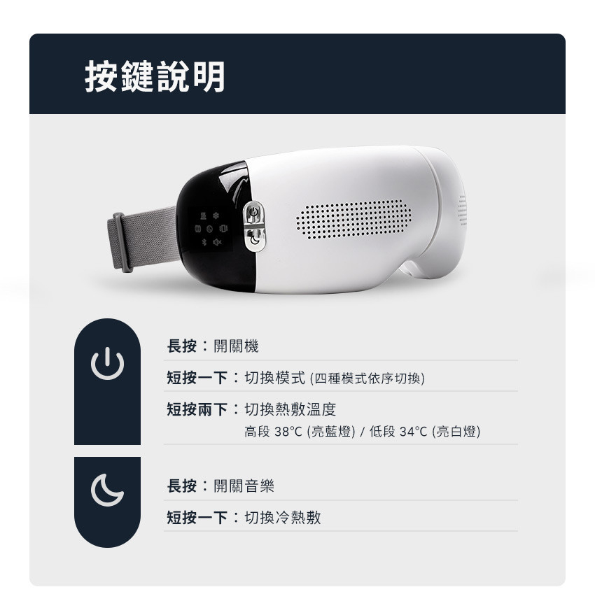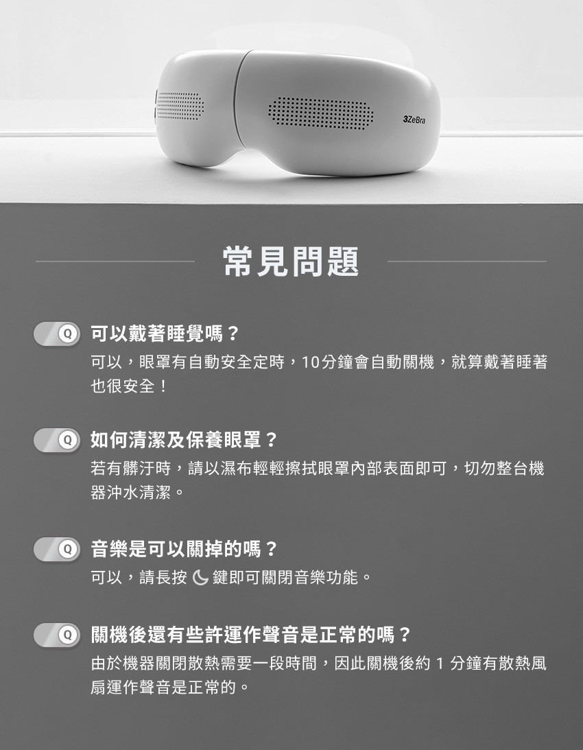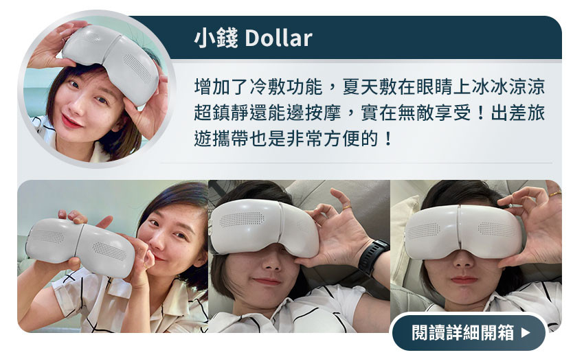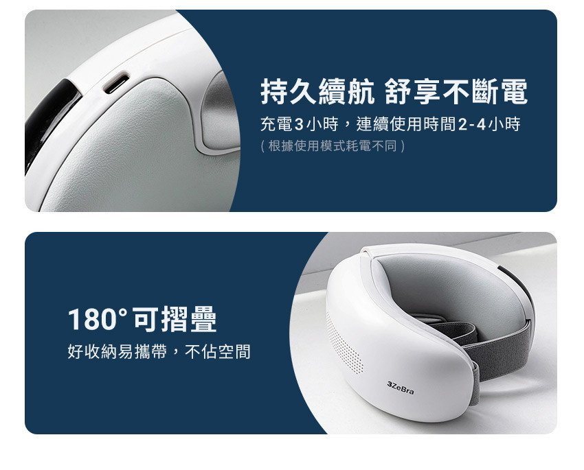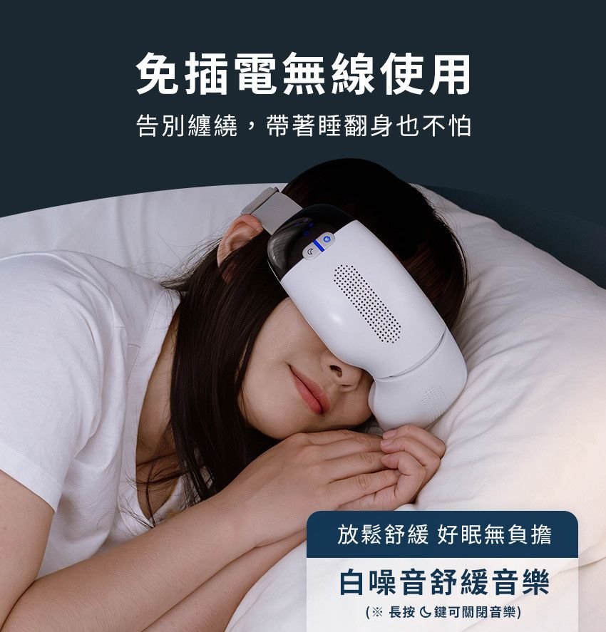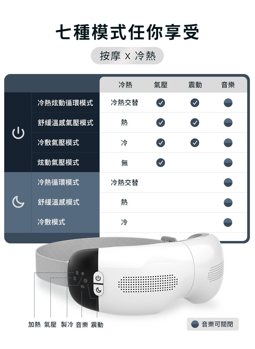 .冷敷 x 熱敷 x 冷熱交替,全新護眼升級! .垂直多層氣囊設計,仿真人揉捏按摩 .獨立太陽穴氣囊,按壓更有感 .NTC 智能恆溫,安全過熱保護 .親膚透氣蛋白皮革,溫和貼近雙眼 .可調節頭帶,180° 可摺疊好攜帶 .免插電無線使用,持久續航不斷電 .10 分鐘智能定時,舒適到睡著也不怕
