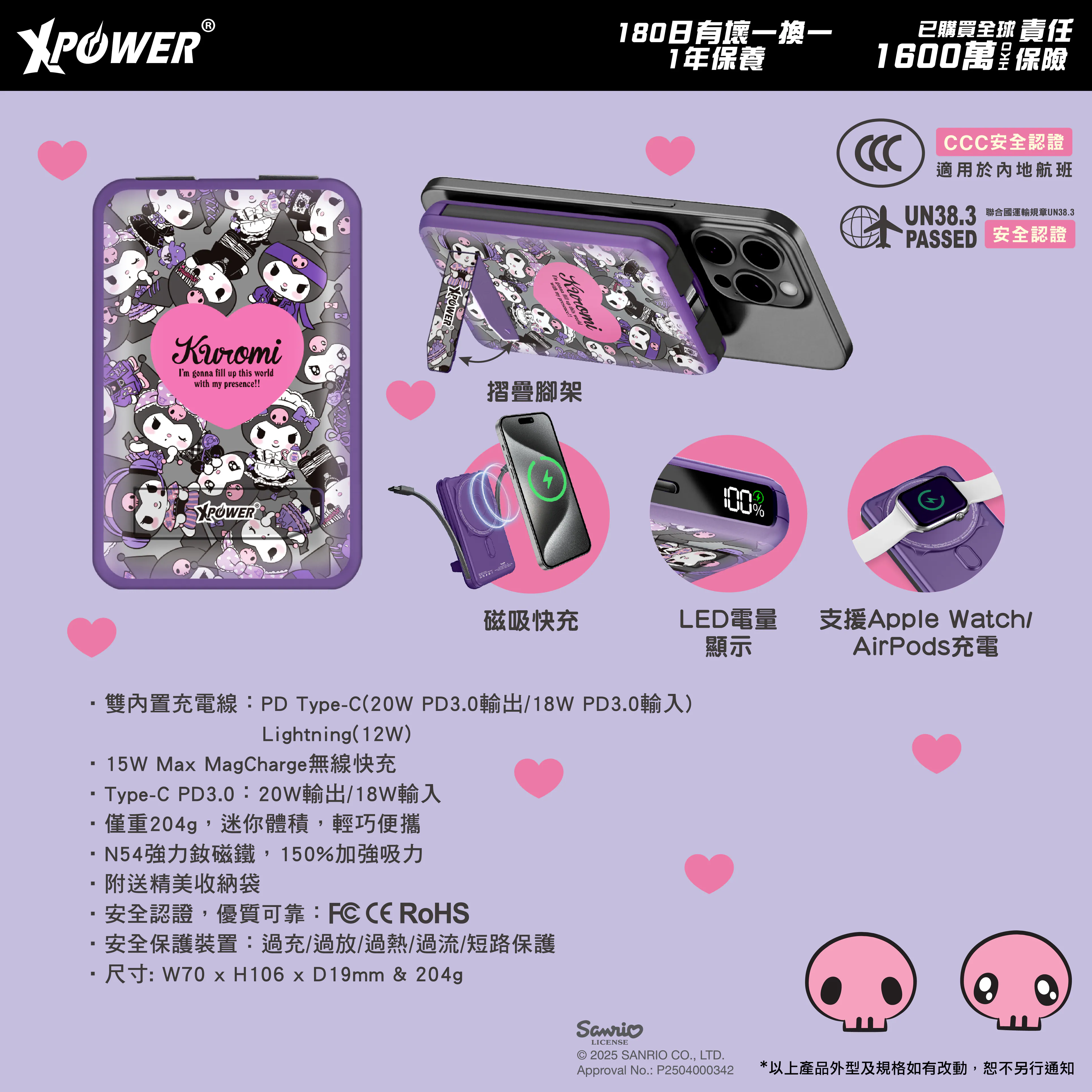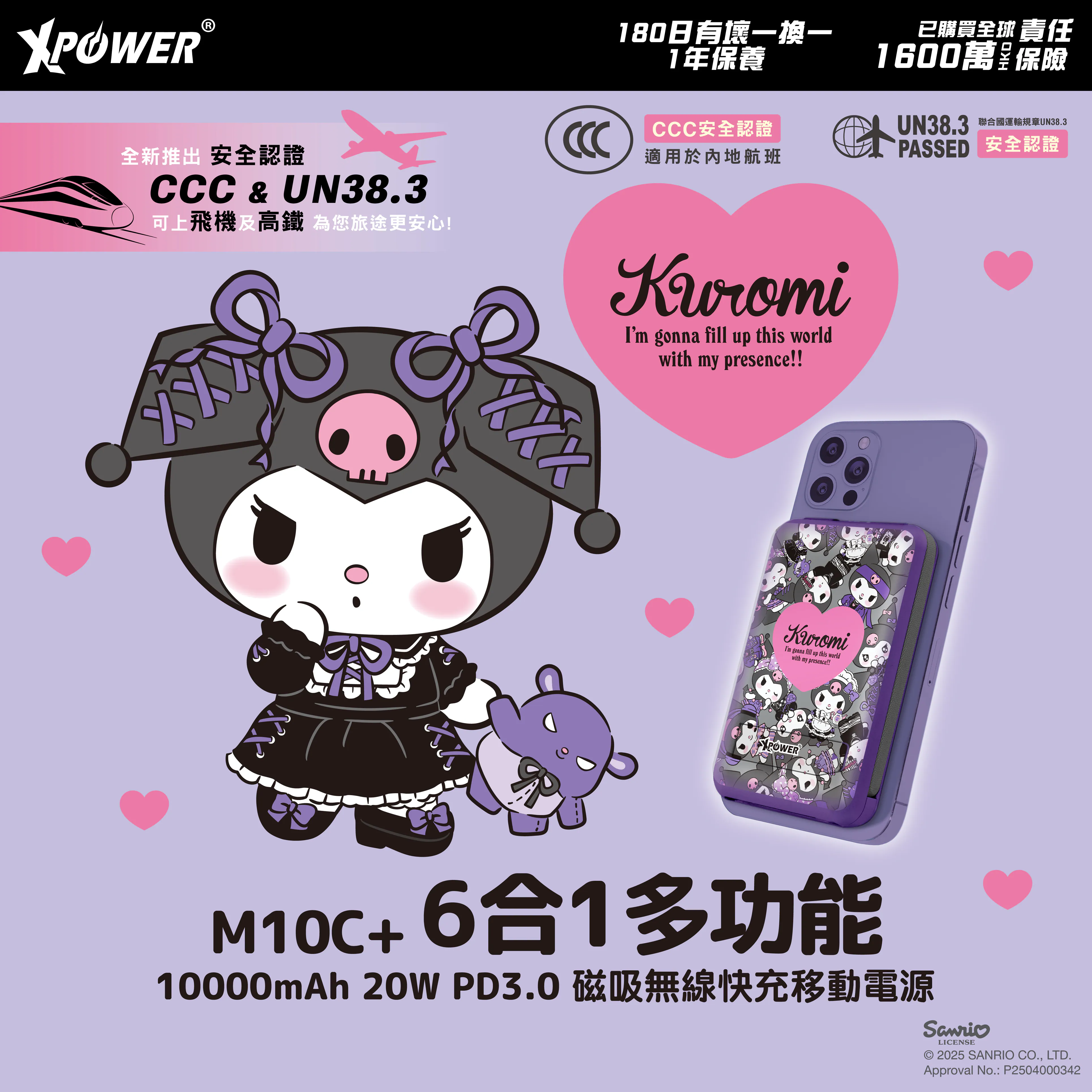 (3C認證)Kuromi M10C+ 6合1 10000mAh 多功能迷你20W PD3.0+ 磁吸無線快充移動電源