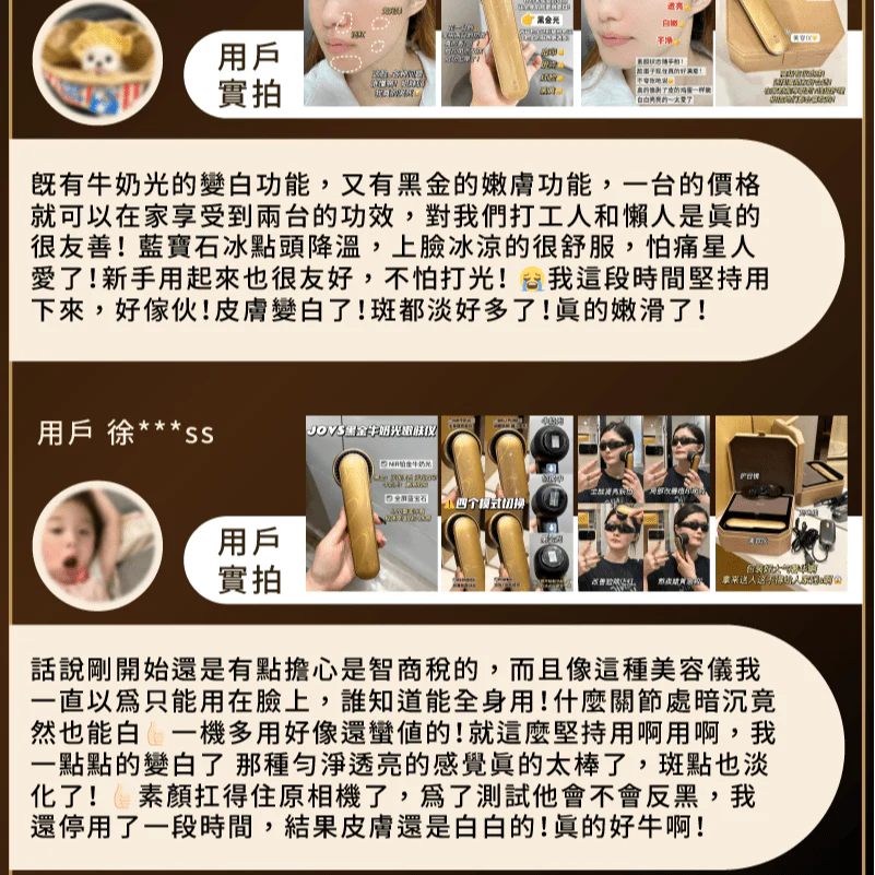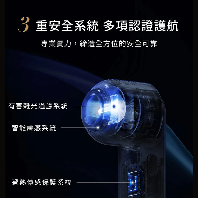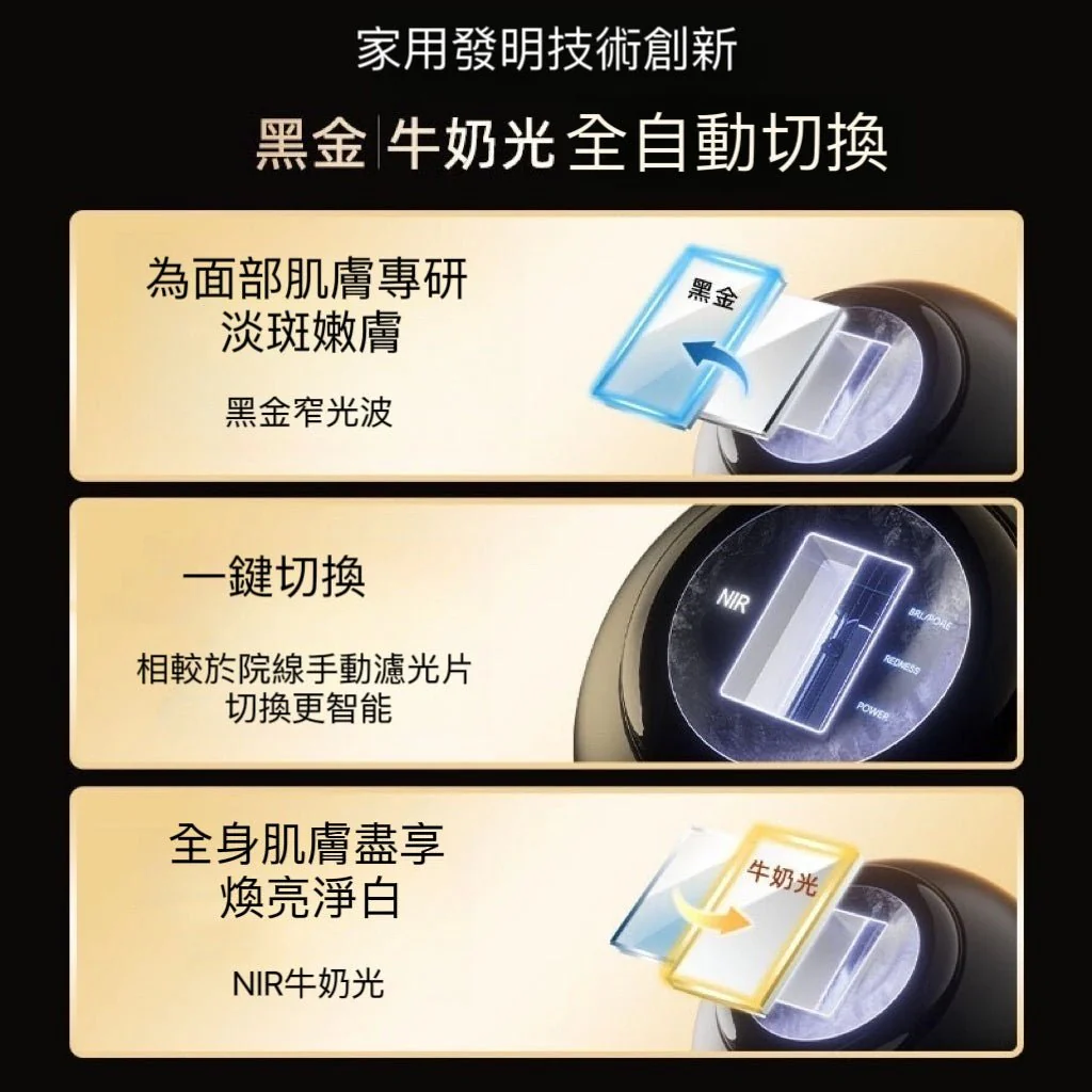 一鍵可自由切換,帶來雙重保養功效,全新4大模式簡單切換(改善毛孔、強力淡斑淡印 以及 改善臉部泛紅,提亮,全身美白澎亮)持續使用輕鬆保養,維持絕佳淨白膚況!採用藍寶石冰點冷卻,加大冰點面積,避免熱損害同時達到無痛體驗,功效獲得專利發明認證,來自美國、日本、歐洲、中國 11大安全認證認可,讓你在家中輕鬆體驗醫學級美白淡斑療程! 8大亮點,淡斑強!代謝快!黑素少!膠原澎! 黑金|牛奶光雙模式自由切換,一台抵兩台 4大模式,解決多重肌膚問題 打造澎亮滑嫩奶白肌 升級全屏藍寶石冰敷,持久冰感 無痛嫩膚 連閃自動打光模式,釋放手指壓力 5分鐘精緻護膚,28天實測見效 無限發數,可循環多次使用 超高性價比 簡單使用小巧便攜,無需使用凝膠不粘膩 3重安全系統,11大安全認證守護 安全有效 改善毛孔/泛紅 x 強力淡斑淡印 x NIR牛奶光 28天見效 冰感無痛,還你肌膚亮、透、白! 黑金DPL超光子:500-650nm 鎖定精準的窄譜光,較傳統光子擁有更強的選擇性,嫩膚更精準!能有效的作用於斑點裡的黑色素,從而使斑點黑色素吸收變淡,快速改善面部色斑和泛紅問題,從而起到嫩白肌膚的效果。 鉑金牛奶光:900-1800nm 可直達真皮淺層至中層,可有效的加熱真皮中的水分子,刺激膠原纖維的新生和重塑,同時透過膚質細膩度的改善,間接增加皮膚折射率,增加皮膚通透性,從而提亮膚色。 全新4大模式 – 配合DPL精準窄頻光波與鉑金牛奶光,一台機器同時達到: 即時提亮膚色 改善臉部泛紅 精緻護膚細膩毛孔 強力淡斑淡印 膠原蛋白再生 使用方法:清潔後保持臉部乾爽,長按開關2秒開機,配戴專用護目鏡,緊貼肌膚感應燈亮起,短按打光鍵打光,短按開機鍵切換模式泛紅、色斑位置單點打光,打光結束後使用保濕面膜 建議開機後可先使用 NIR牛奶光模式(無冰點),可每天使用。 細膩毛孔模式(BRI./PORE)可全臉打一遍,改善泛紅模式(REDNESS)跟強力淡斑模式(POWER)就針對性打一遍即可,這樣會更全面效果更好,建議每週使用2~3次。 產品規格: 產品尺寸:499*256*200mm 輸出頻率:60W 電壓: 24V (100V-240V) 重量: 272g