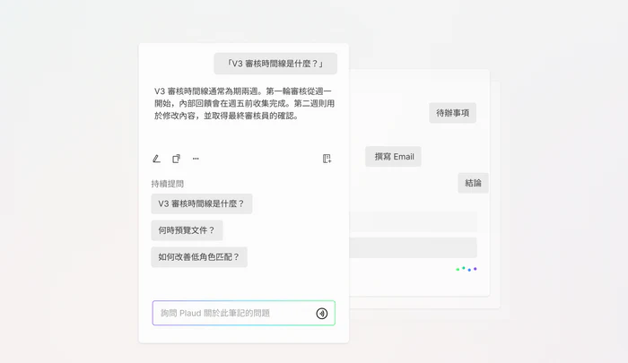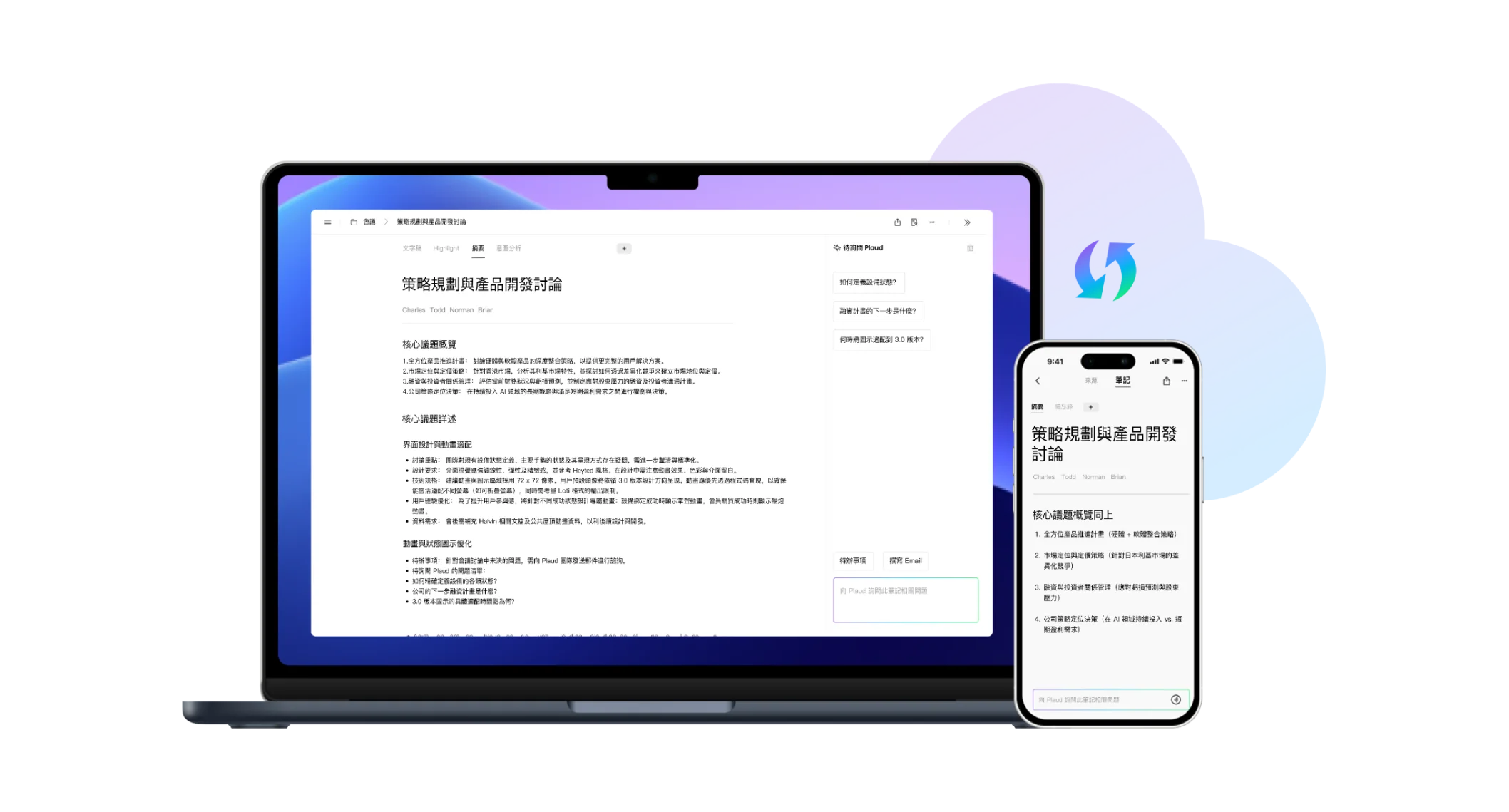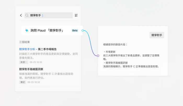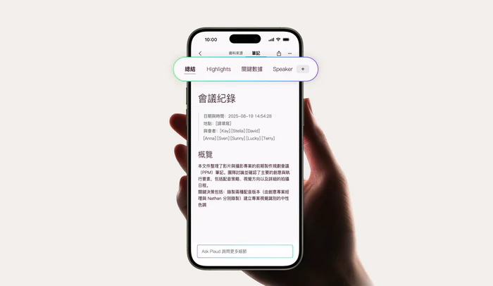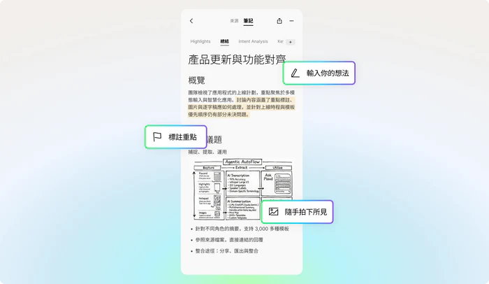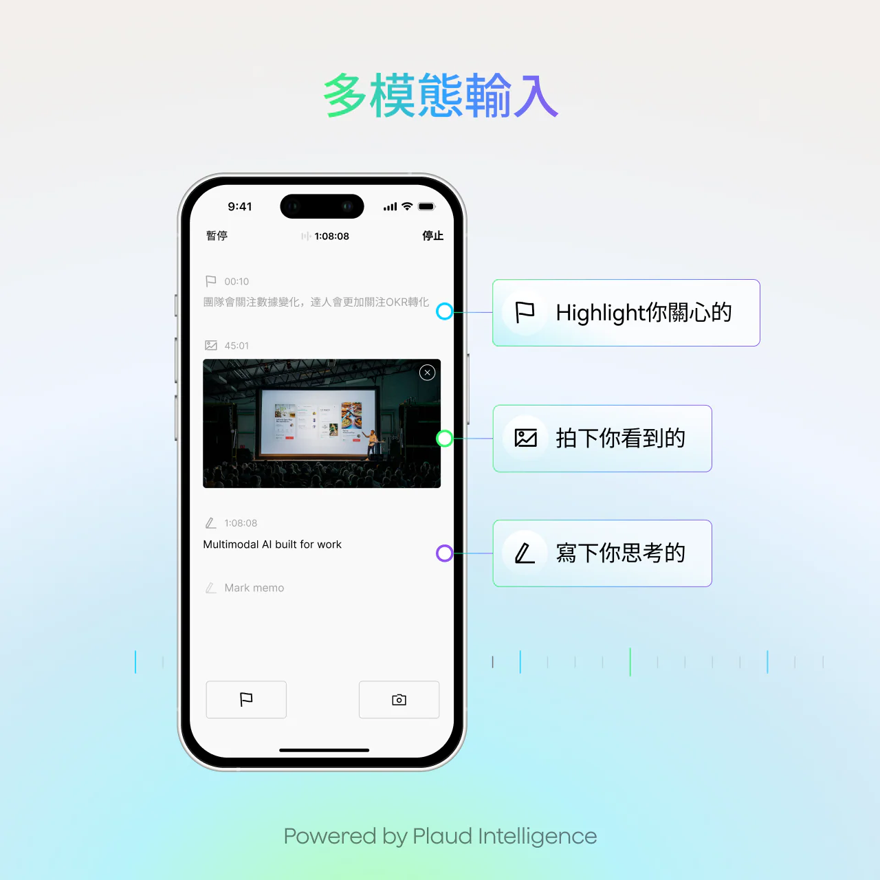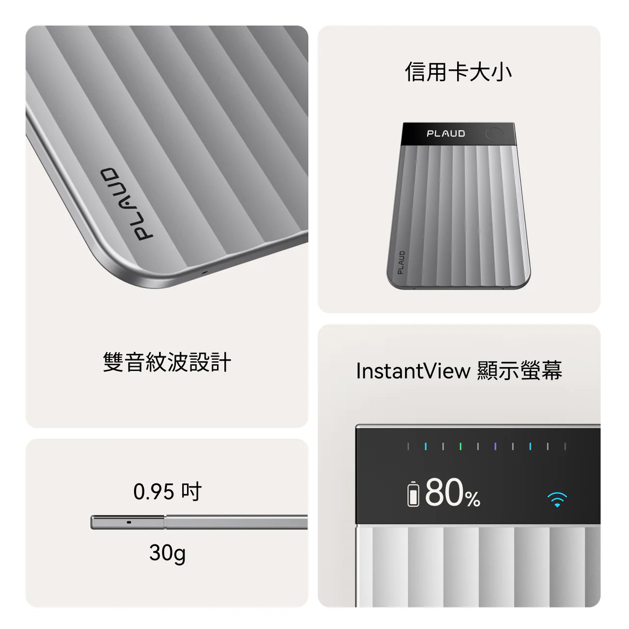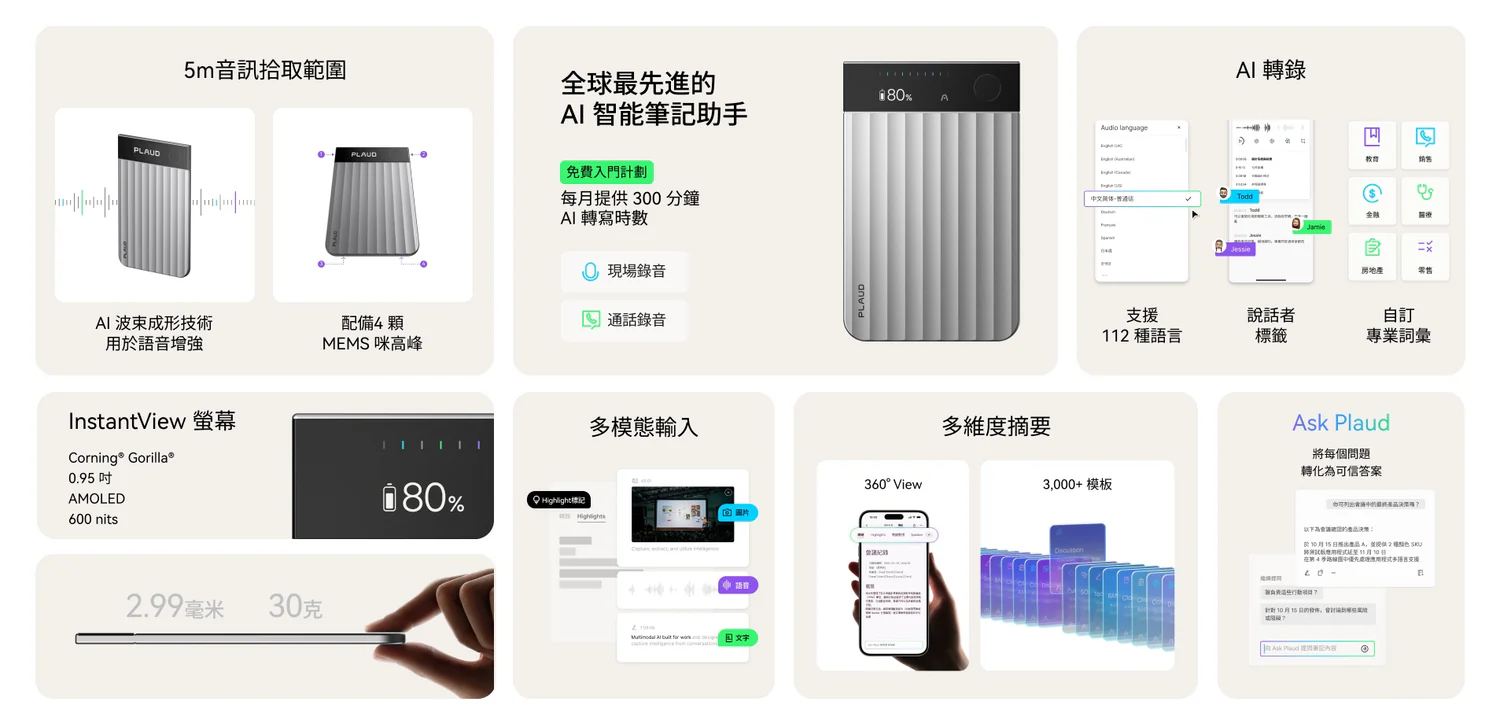 世界先進的AI錄音裝置,助你全面轉型,在 AI 時代中輕鬆工作。當你透過語音、文字或影像記錄關鍵時,Plaud Intelligence 會將它們以跨時間和語境的方式連結起來,在會議之間建立連續性,追蹤重覆出現的主題,並得出切實可行的模式。它不單會總結語音內容,更會理解你的構思如何逐步發展。 全方位輸入 (AutoFlow):支援文字、圖片、語音、音訊上傳及手機小工具,一站式捕捉所有靈感與資訊。 112 種語言 AI 轉錄:高精準度語音轉文字,輕鬆處理多語環境溝通與紀錄需求。 多維摘要與自動會議紀要:透過大型語言模型自動生成重點摘要、行動項目與紀要內容。 智能問答系統 (Ask Plaud):可根據資料內容即時提問、獲取見解,成為你的專屬 AI 助理。 跨檔案全域搜尋:數秒內找出關鍵資訊或細節,大幅提升資料整理效率。 AI 原生硬件與軟件整合:全面優化運算效能與操作流暢度,打造專屬智能工作平台。 專業級高準度轉錄:結合 Whisper Large V3 與 Azure 模型,準確識別講者與專業術語。 深度思考與重點標註模式:支援長篇推理回應與 30 秒關鍵語音標註,輕鬆抓住核心內容。