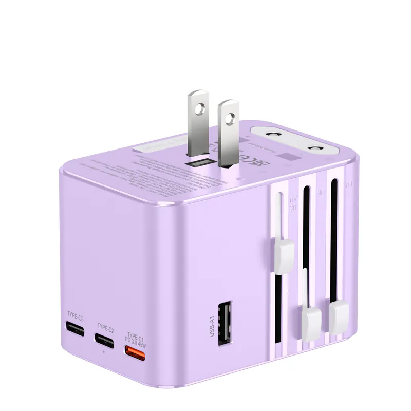 阿婆TA45B 45W 6輸出PD3.0/PPS旅行充電器 •3 x TYPE-C輸出 (45W PD 3.0/PPS/15W輸出) •獨立TYPE-C插口可輸出45W,支援快充Macbook Pro •2 x USB(12W輸出) •6輸出:AC+3xType-C+2xUSB •1000W/2500W高功率AC輸出,適用於風筒、旅行水煲等不同電器 •4種旅行插頭 [UK/AUS/EU/US],支援環球超過198個國家地區 •100-250V環球通用電壓 •附送保護袋及備用10A保險絲 •超輕161g,減輕行李重量 •安全認證: CE, FCC, UKCA, IEC62368-1 •安全保護裝置:短路/過充/過熱/過流保護 •尺寸: W55 x H75 x D52mm & 161g