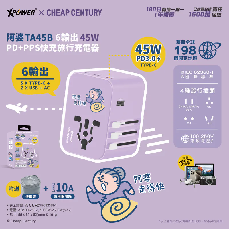 XPower x 阿婆TA45B 45W 6輸出PD3.0/PPS旅行充電器