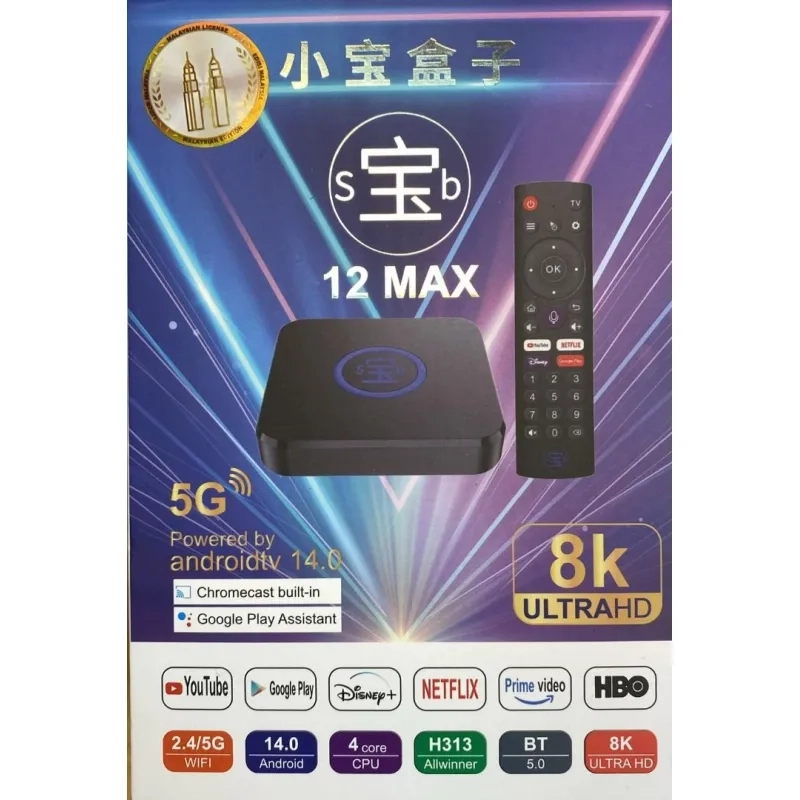 SBTV 小寶盒子 12 MAX 新一代智能電視盒子【全球通用】 直播界中的王者 MoonBow 📺 EPG 節目預告 📡 新聞、電影🎬、 體育🏀頻道 ⏪ 七天回看,主要頻道 🌍 全繁體简体中文可以切换 ⚡️ 播放順暢 🌏 可在 中國大陸 使用 中國大陸 建議使用網絡🛜 聯通 和 中國電訊 🙅🏻♂️不用翻牆 VPN(專供大灣區客戶)🌏😎 不再怕錯用地區鎖機變磚頭🧱 支持⬆️8K Ultra HD 電影🎬分類 享受😋 ✨ 影院上演 同步天天更新 💥💥 4K 專區 💥💥 最新上架 💥💥 高清專區 💥💥 Netflix 杜比 💥💥 粵語專區 💥💥 系列專題 獨家之處: ✅ 自家1個直播點播 ✅ WhatsApp真人客服 有問題馬上處理 ✅ 可向要求增加app於應用市場 ✅ 除了直播體育🏀還有 點播體育NBA 等等 ☝️ 足球盃賽 ✅ 老人家喜愛👩🏻🦳👨🏻🦳 粵劇專區 ✅ 小朋友🧒 兒童專區 ✅ 大朋友👯♀️ 開心🥳 Spec: Wifi 2.4/5G Lan 10/100M 2G + 16G H.265 H.265 Decoding Android 14 ChromeCast Built In **aa 支援 YouTube、Google Play、Disney+、Netflix、Prime Video、HBO Smart Voice, TV Box, Voice Assistant Remote Control** 此產品是多媒體播放器,使用 Android 系統,並具備互聯網功能。產品沒有預載任何應用程式,客戶購買後需自行安裝所需軟件