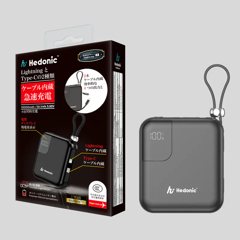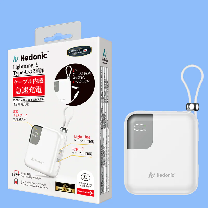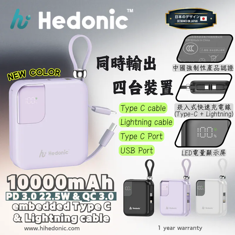 [CCC認證 & CE 認證 & ROHS 認證] Hedonic 10000mah (38.5Wh) PD 3.0 22.5W Lightning & USB-C Power Bank 黑色/白色