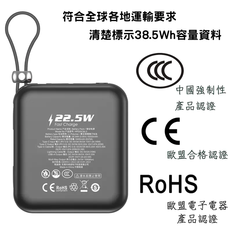 Hedonic 10000mah 第3代雙線充電池安全證書 ⭐CCC中國強制性產品認證 ⭐CE歐盟合格認證 ⭐ROHS 歐盟電子電器產品認證 ⭐符合全球各地運輸要求清楚標示38.5Wh容量資料 容量:10000mAh/38.5Wh 輸出:PD 3.0 DC5V/3A 9V/2.22A 10V/2.25A (SCP)12V/1.67A(20W/22.5W) 輸入:PD 3.0 DC 5V/3A、9V/2A、12V/1.5A(18W) 尺寸:75 X 66 X 24.5毫米 重量:176公克 保固期:1年