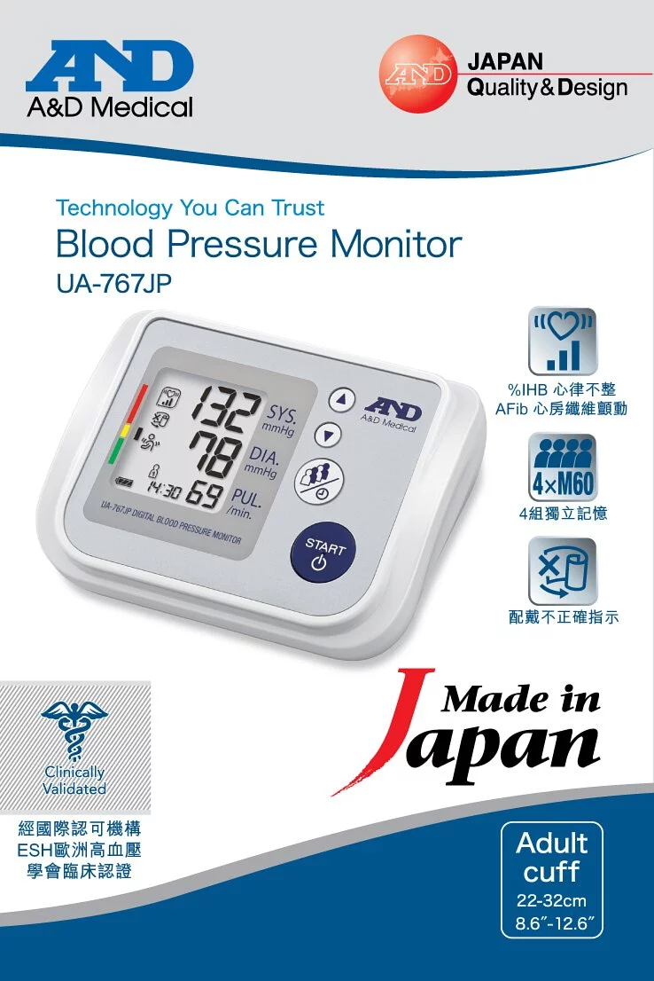 原裝香港行貨 日本製 < 5年保養 > AND A&D Medical日本愛安德 - 手臂式電子血壓計 手臂式血壓計 UA767JP 顏色隨機