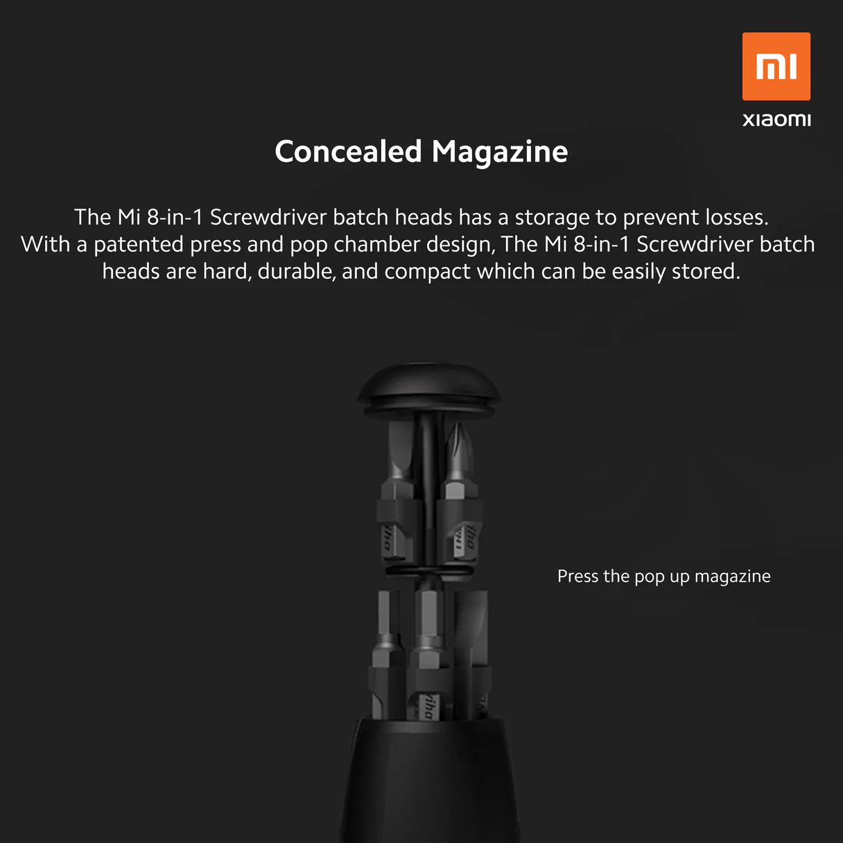 輕巧一體化 小米8合1螺絲起子採用專利設計和獨特的生產工藝,為使用者帶來全新體驗。它便捷、多功能且易於使用。 隱藏式彈匣 小米8合1螺絲起子的批頭設有收納盒,防止遺失。採用專利按壓彈出式彈匣設計,小米8合1螺絲起子的批頭堅固耐用且小巧,方便收納。