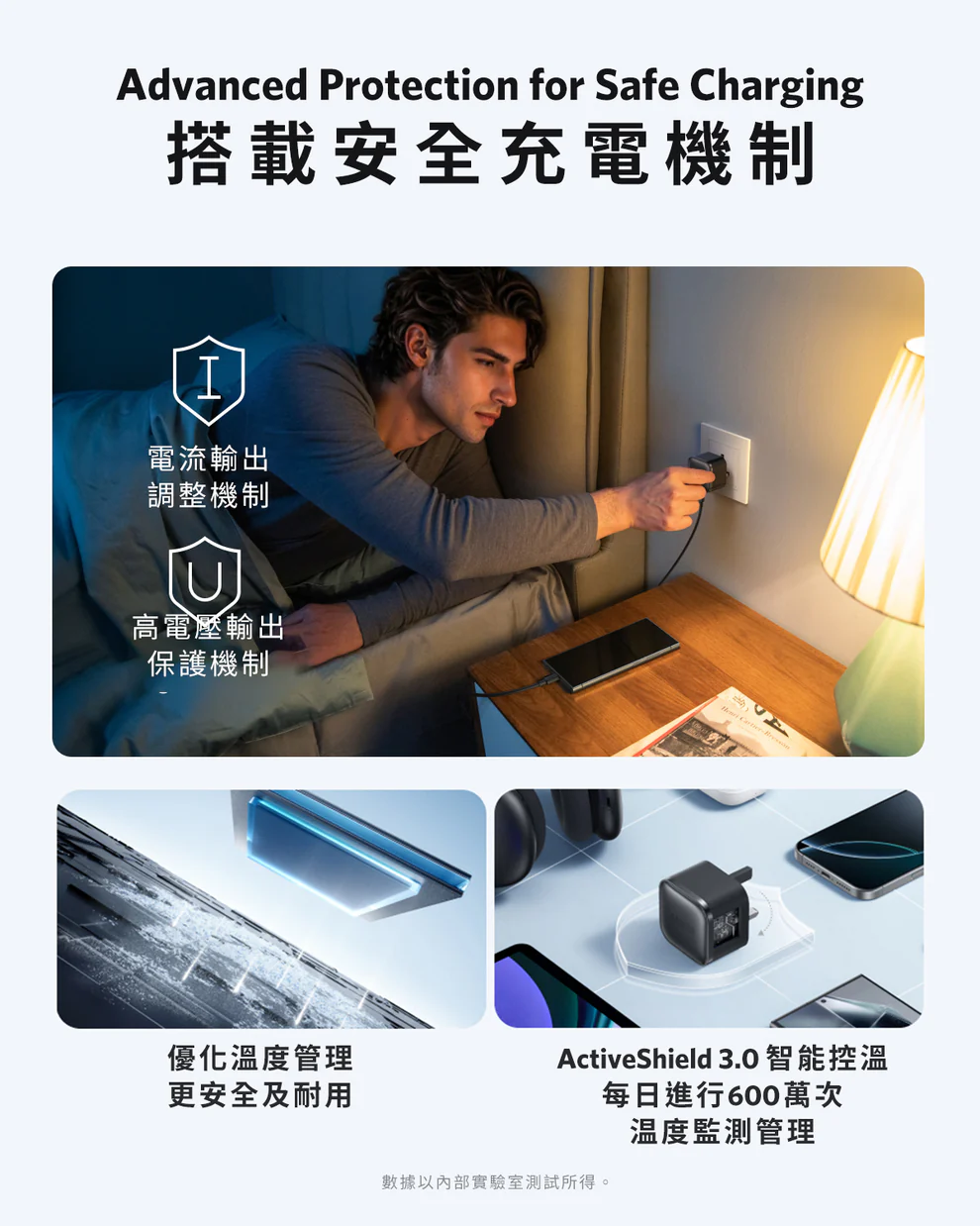 搭載 ActiveShield 3.0 智能控溫機制,每日進行600萬次温度監測管理,以防充電過熱,並搭載電流輸出調節機制、過壓輸出保護機制等,為你的裝置安全地進行充電。