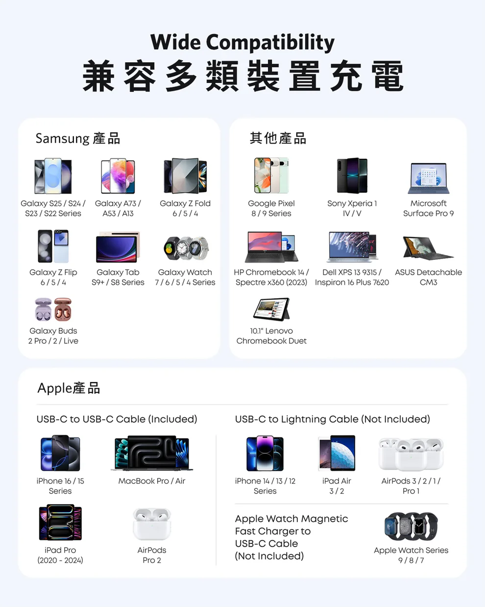最大 45W 的輸出,無論是像 Samsung 等 Andriod 手機還是 Apple 的 iPhone、iPad 等裝置也能使用。