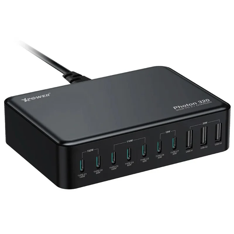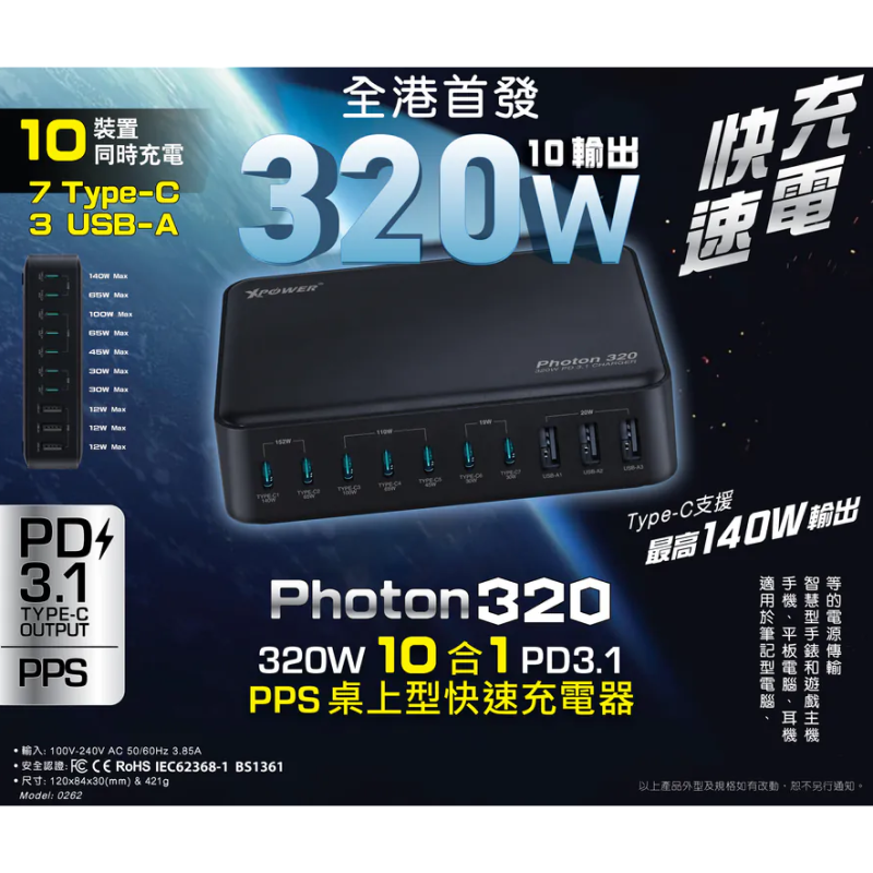 PHOTON320 320W 10 合 1 PD3.1/PPS 桌上型快速充電器 •最高320W輸出 •Type-C支援140W PD 3.1 & PPS •10x 輸出: 7x Type-C & 3x USB •可充macbook/ iPhone16/ 大部份Android/ Switch(支援Dock Mode) •10裝置同時充電,效率更高 •安全認證 : CE, FCC, RoHS IEC62368-1 , BS1361, •安全保護裝置: 短路/過充/過熱/過流保護 •輸入: AC100~240V 50-60Hz 3.85A •尺寸: W120xD84xH30(mm) & 421g