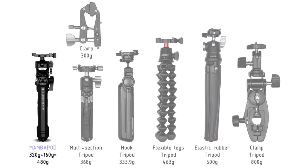 如果您同時攜帶腳架和夾鉗,總重量將會是 300g+200g+200g=700g