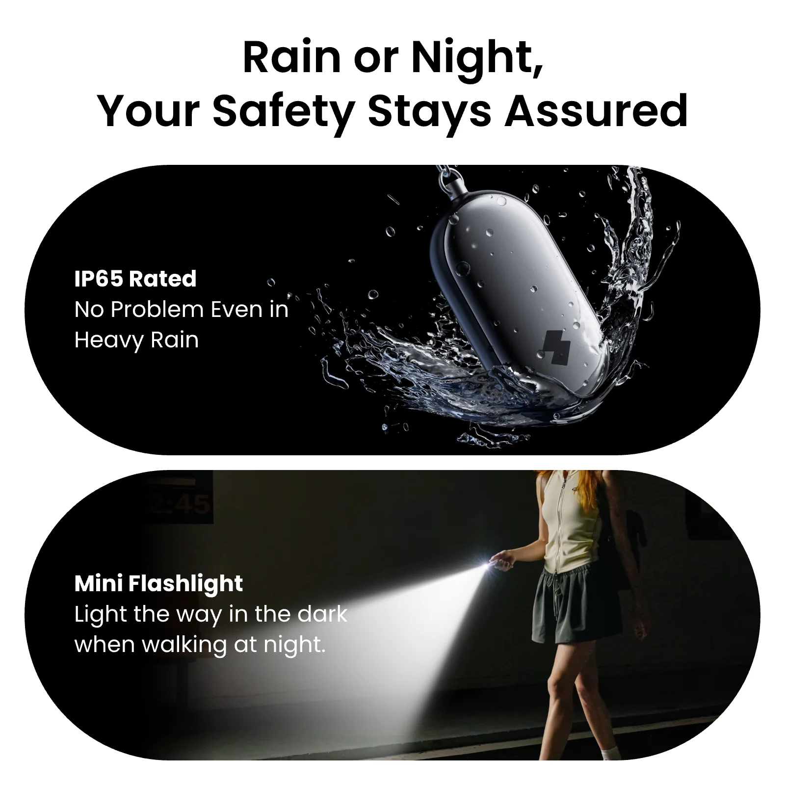 超響警報和閃光燈:內建高亮度頻閃燈(持續閃爍超過1小時)和130分貝超響警報,可使攻擊者失去方向感並迅速引起注意-非常適合夜間或光線昏暗的環境。
