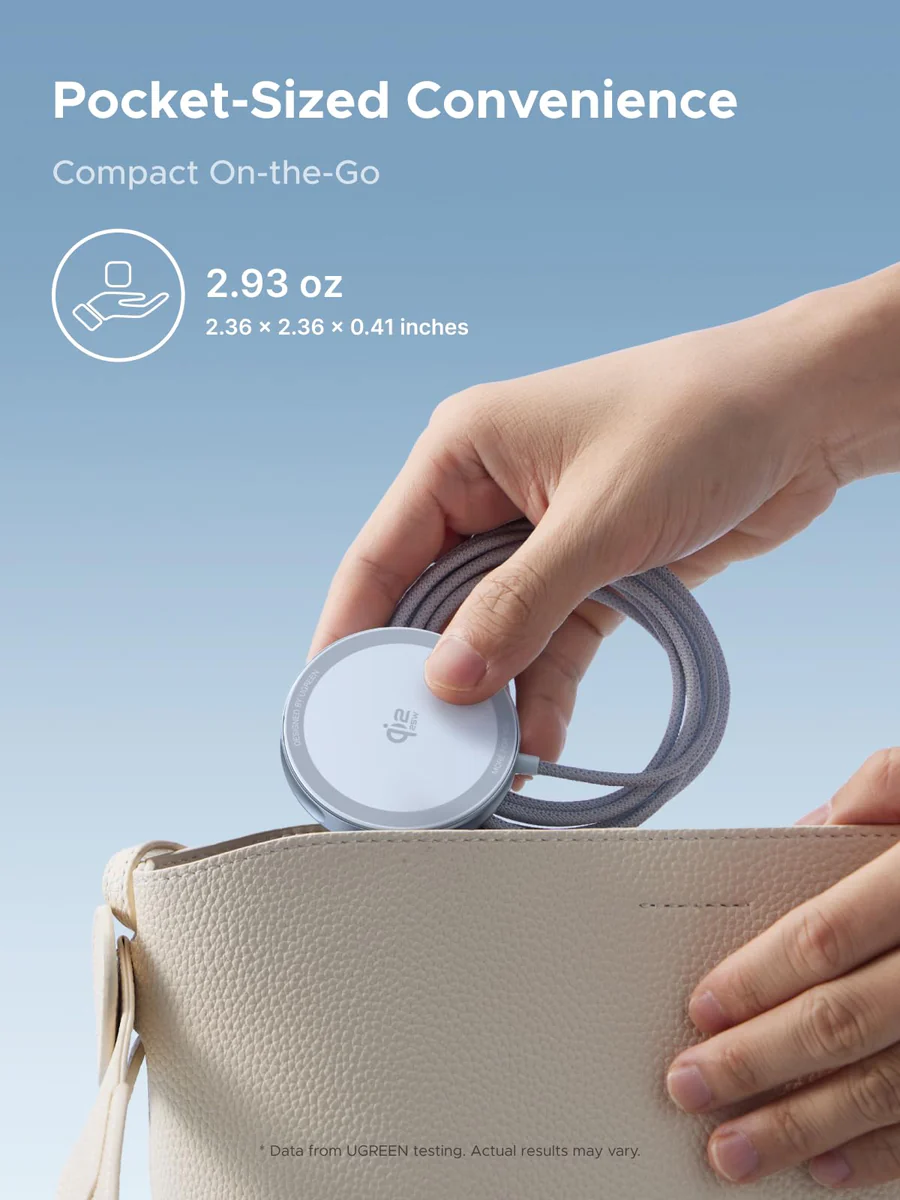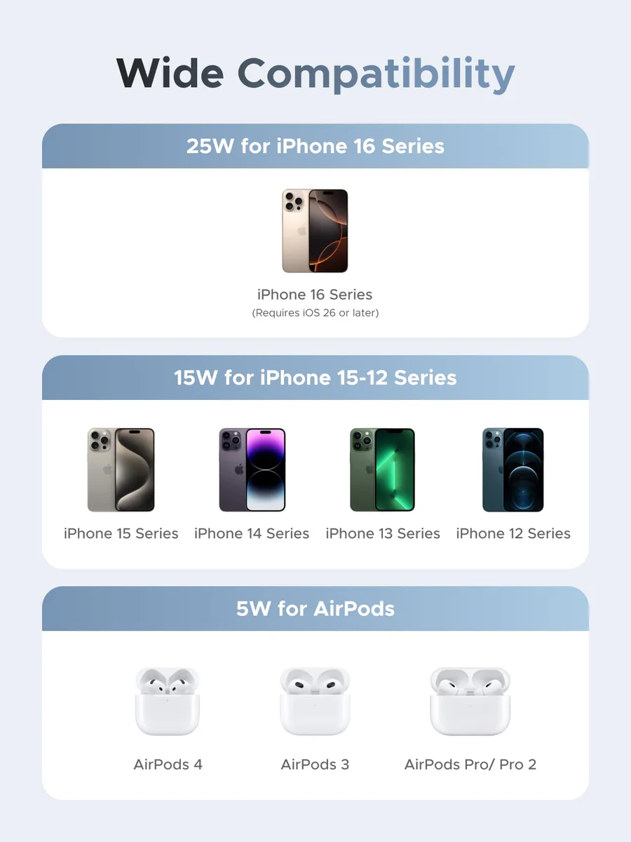 這款無線充電解決方案相容於最新的 Qi2 標準,提供高達 25W 的磁吸式充電功率。它完全符合 iPhone 17 的建議規格,可在 30 分鐘內充電至 50%。自動磁吸設計確保輸出穩定,而廣泛的兼容性和多重保護設計則保證了安全性和舒適性。這款新一代充電解決方案輕薄便攜,方便攜帶。 Qi2 標準 × 25W 快充 它相容於最新的 Qi2 標準,最高輸出功率可達 25W。完全符合 iPhone 17 的建議規格,只需 30 分鐘即可充電至 50%。它提供了以往 15W 充電器無法實現的「實用級」快充。 磁吸式設計和輕薄便攜 磁吸式設計可自動吸附並對齊,提供穩定供電,避免錯位。纖薄輕巧的設計可輕鬆放入口袋,方便您外出或旅行時攜帶。它能完美地收納在您的包款中,讓您隨時隨地舒適充電。 廣泛的兼容性和安全防護設計 它支援 iPhone 17/16 系列和 Pixel 10 Pro XL 的 25W 快充,以及其他眾多 iPhone、Pixel 手機、AirPods 和支援 Qi 無線充電的裝置。它還具備多重保護功能,包括過充保護、高溫保護和異物檢測,即使在高速充電下也能確保安全。