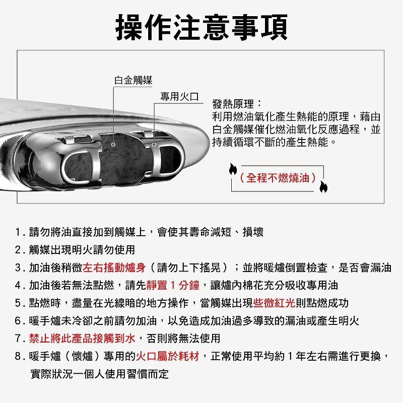 可提供連續使用約6小時,建議搭配ZIPPO原廠專用油 流線小巧的外型設計、讓您方便攜帶使用 無火焰燃燒讓您安心使用,適合所有寒冷天氣活動 採用全金屬材質製成、品質保證耐用堅固 盒裝內附填充油杯,需使用ZIPPO專用油 .新品內未含燃油,須另外購買ZIPPO原廠專用油填充使用 .網頁圖片顏色因電腦螢幕不同,會略有色差,請以實品顏色為主 .請務必套上內附專用袋後再使用,必免造成燙傷 .限18歲以上成人使用並請勿在睡眠中使用 .加油請照油杯標示為主勿過度加油,以免造成懷爐損壞 .請勿長時間在同一部位使用並避免與電毯或電暖器等同時使用 .請遵照內附使用說明書正確操作,以避免危險發生 .辦理退貨請將商品恢復至原狀,如有加入過燃油或破壞商品恕不接受退貨,建議收到貨後請先檢查有無異狀後再使用 如因顏色差異,恕不接受退款 使用方式 1. 打開懷爐上蓋及火口,將ZIPPO專用油,加入專用油杯上限處,再導入爐體中 (至刻度上限處,能連續使用6小時左右) 2. 用火機燒火口內之觸煤棉10秒,然後合上蓋子,懷爐立即溫熱 (無須使觸煤棉至燃燒狀態) 3.懷爐需放入專用袋,再放於身上需要取暖之部位,如:手部/口袋均可達到取暖效果 (提前不使用時,只需將火口撥下即可)